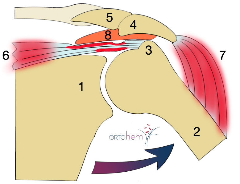 Slika 1. Shematski prikaz zgloba ramena. Konkavno, udubljeno zglobno tijelo je glenoid lopatice, skapule (1), a konveksno glava nadlaktične kosti, humerusa (2). Izbočeni dio glave humerusa gdje se hvata većina tetiva rotatorne manšete zove se veliki tuberkul (3). Glavu humerusa natkriva akromion (4) koji je također dio lopatice s kojom je povezan preko koštanog grebena, spine skapule. Na akromion se spaja ključna kost, klavikula (5). Mišić supraspinatus (6) je jedan od četiri mišića rotatorne manšete i hvata se za veliki tuberkul. Uz mišić supraspinatus abdukciju nadlaktice čini i mišić deltoideus (7) koji polazi od akromiona i hvata se za vanjski dio humerusa. Između tetive mišića rotatorne manšete i donjeg dijela akromiona nalazi se subakromijalna burza (8) koja smanjuje trenje pri pomicanju struktura koje ju okružuju.
