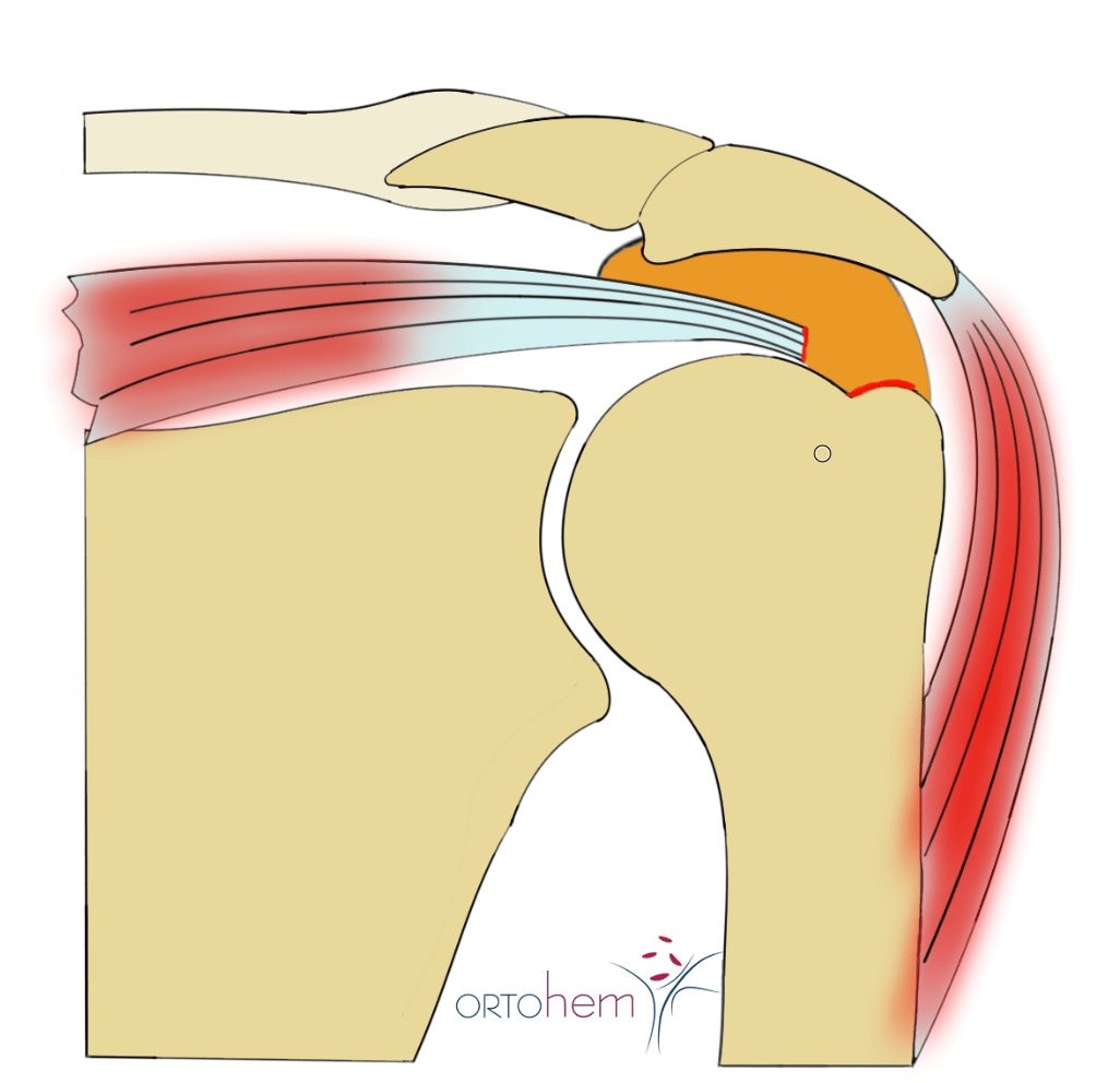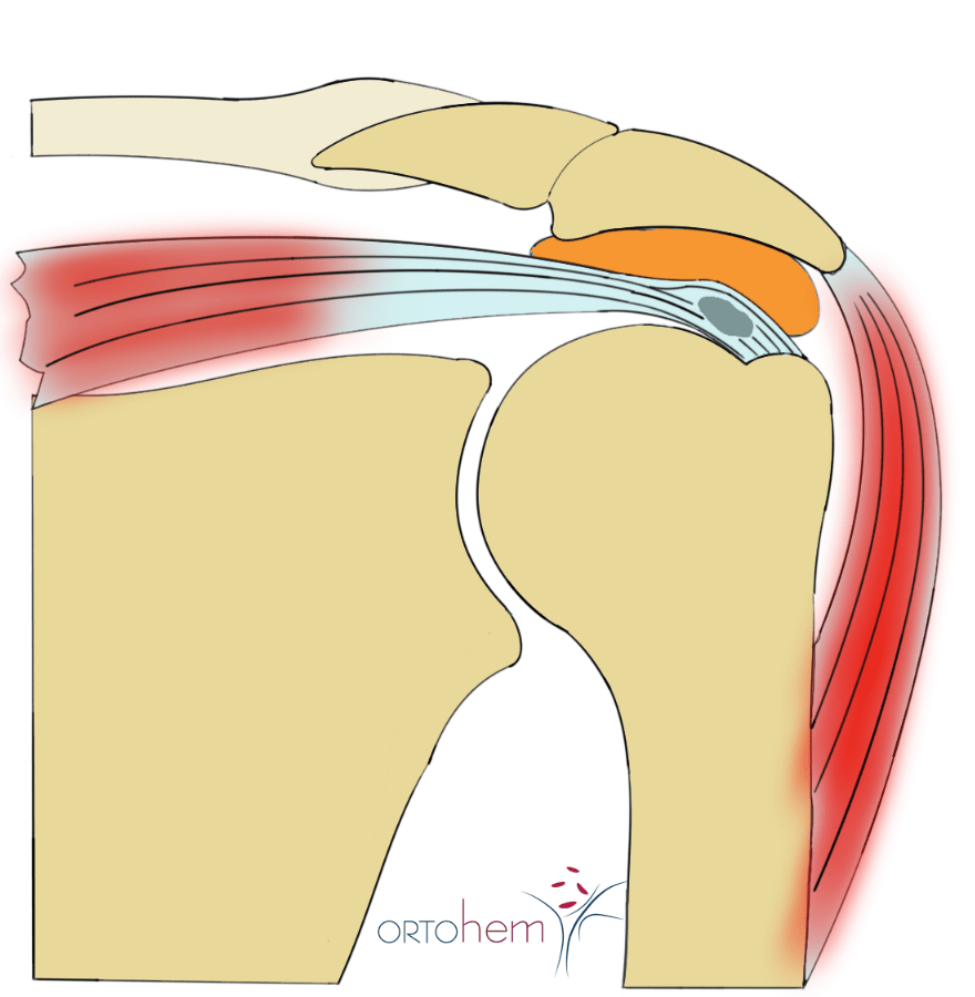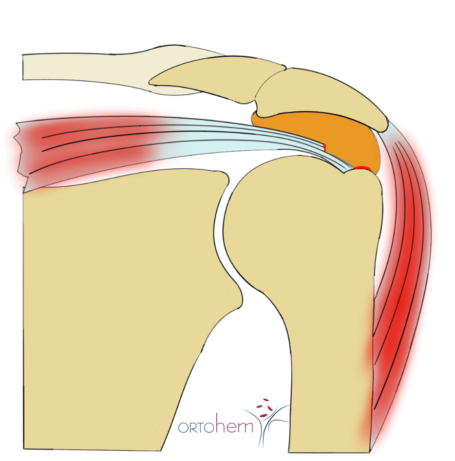 Slika 4. Shematski prikaz parcijalnog puknuća tetive mišića supraspinatusa sa subakromijalne strane. Takvo puknuće dovodi do pojave bola koja je često jača nego kad dođe do kompletne rupture tetive. Takvo puknuše tetive povezano je i s mišićnom slabošću te ograničenjem pokretljivosti. Liječenje se najčešće započinje konzervativno fizikalnom terapijom, no ukoliko takva terapija ne dovede do poboljšanja radi se operacija u smislu artroskopske rekonstrukcije puknute tetive.
