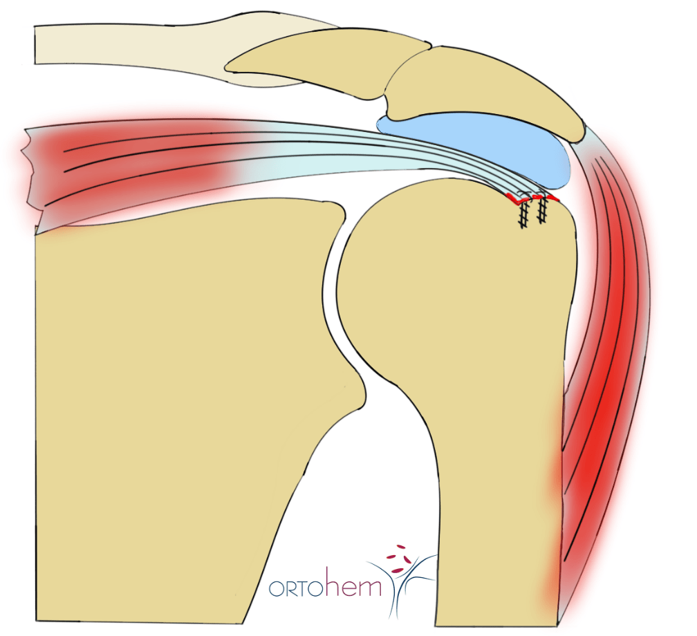 Slika 5. Shematski prikaz kompletnog puknuća tetive mišića supraspinatusa na hvatištu za veliki tuberkul humerusa. Takvo puknuće dovodi do bolnosti, slabosti i ograničenja pokretljivosti u ramenu. Ukoliko se ne pristupi ranom liječenju takva tetiva sklona je povlačenju u dubinu ramenog zgloba prilikom čega se bolesnik žali na pogoršanje tegoba, a samo liječenje je puno teže i povezano s lošijim ishodom liječenja.